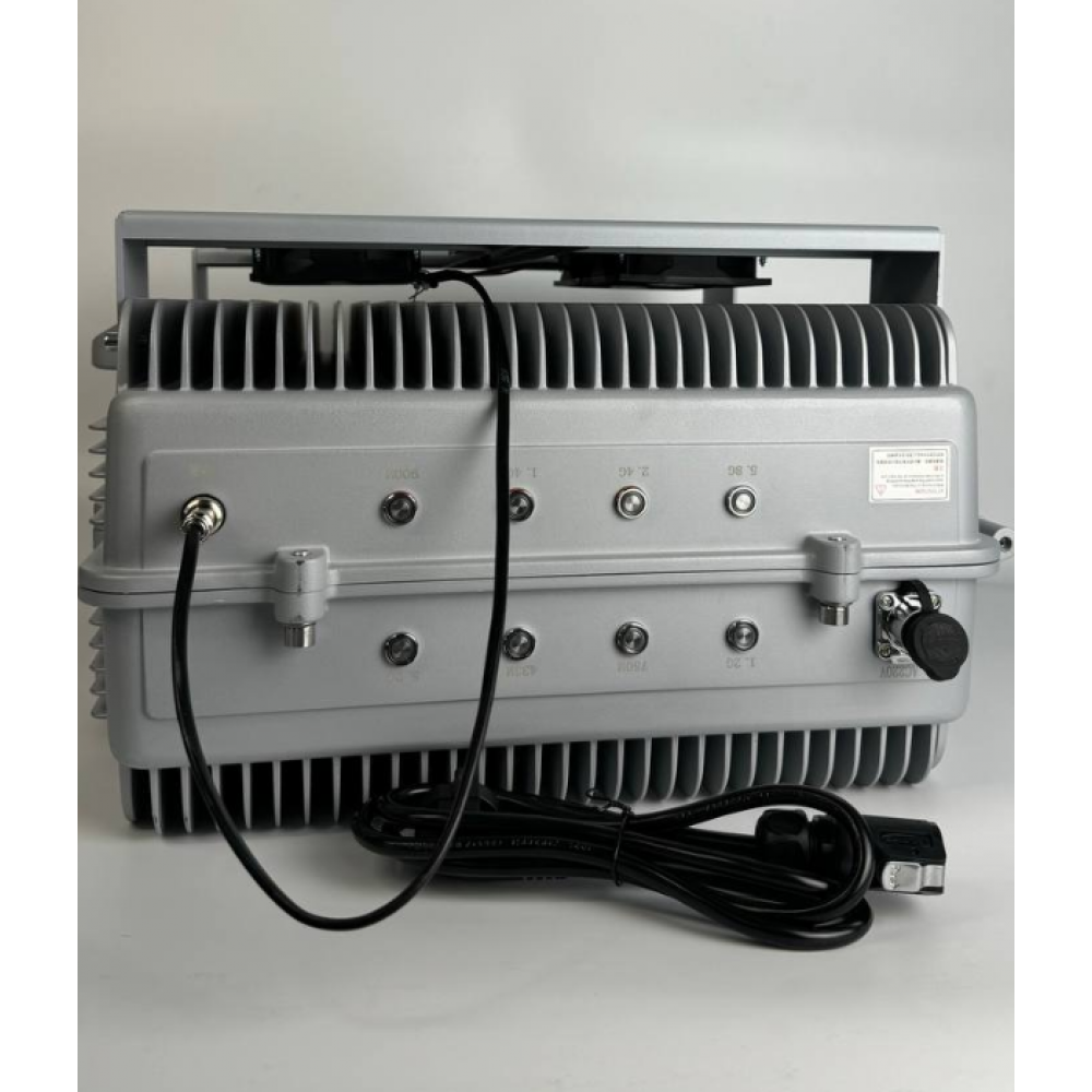 Корпус устройства выполнен с защитой по стандарту IP65, что позволяет использовать блокиратор в любых уличных условиях, обеспечивая надежную работу даже при сильном воздействии окружающей среды. Эффективная система охлаждения, включающая четыре мощных вентилятора и металлический корпус радиаторного типа, гарантирует возможность круглосуточного использования устройства, обеспечивая постоянную защиту без риска перегрева.