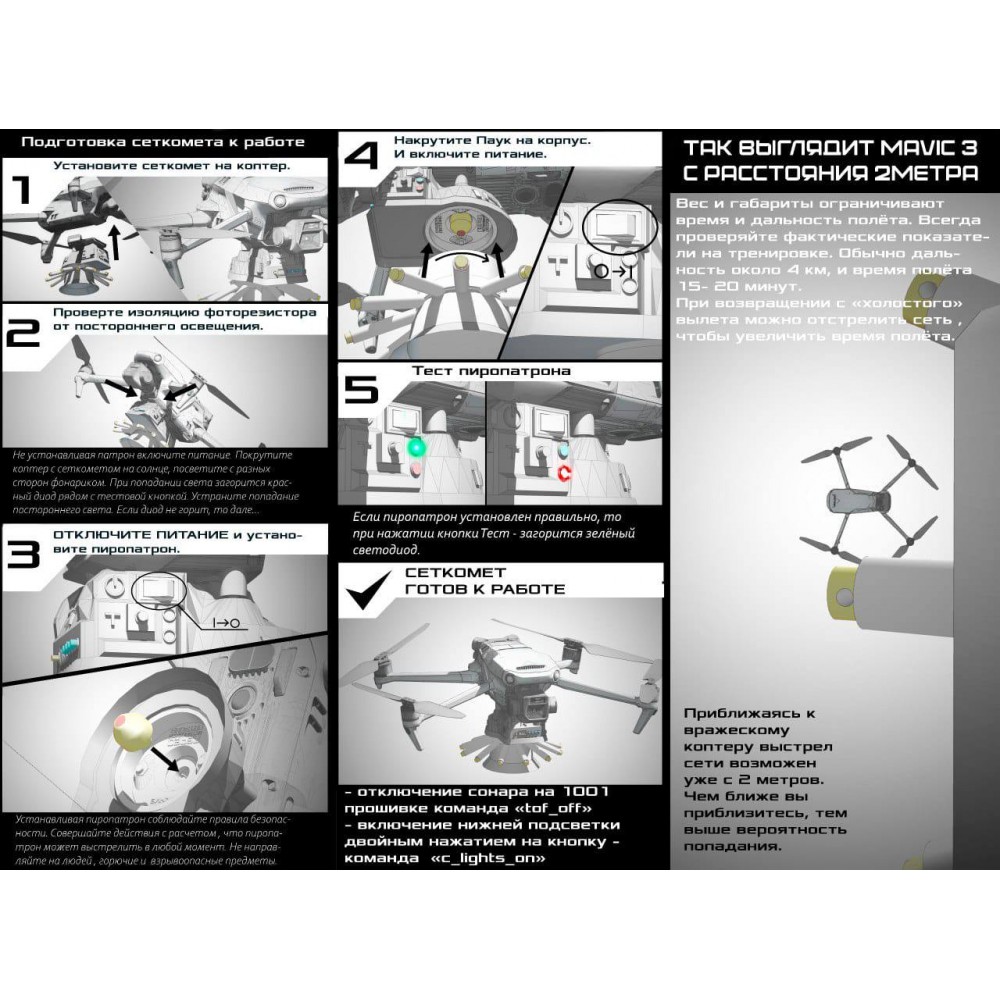 Сеткосброс/сеткомет «Тарантул» предназначен для перехвата квадрокоптеров. Устанавливается как дополнительное оборудование на квадрокоптеры DJI Mavic 3, DJI Mavic 2, Autel Evo 2, Uco, и может быть установлен на FPV.